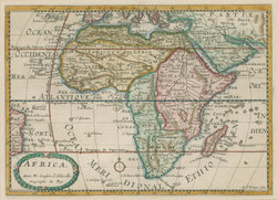 A reduced version of Sanson’s larger map of Africa. This map shows the continent of Africa with the Arabian peninsula, the southern part of Europe and the eastern portion of Brazil. This map is from a Dutch edition of the 1697 German edition of Geographia Universalis… which in turn was derived from the French edition of 1690.