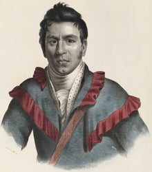 The results of years of struggle, McKenney’s portfolio was finished in 1844, when completed consisting of 117 portraits and three frontispieces.  Although he was acutely aware that he was preserving a chapter in history, he could not have known that had he not undertaken this project almost no record would remain, for in 1865 a fire at the Smithsonian destroyed almost all the original paintings from which the lithographs were drawn.  This print is one that remained since the nineteenth century in one of the publisher’s warehouses, having been only partially colored and never issued.  Thus the excellent condition is explained by the print never having been subjected to the vicissitudes of the open market, and the chance survival for over a century and a half is most fortuitous.