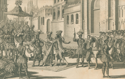 James Mynde. "The Interview of Cortes and Montezuma in the City of Mexico". From John Harris' A Complete Collection of Voyages and Travels . . ."