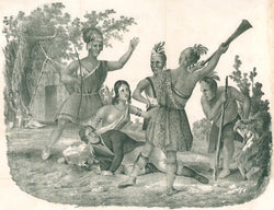 During the nineteenth century, the image that white Americans held of the American Indian changed from admiration of the “noble natives” to hatred and fear of the “wild savages.” This view is graphically represented in a series of primitive lithographs from John Wimer’s Events in Indian History, a history of the troubled relationship between the European and Indian cultures. Wimer’s views show instances of peaceful encounters and of savagery by both parties.