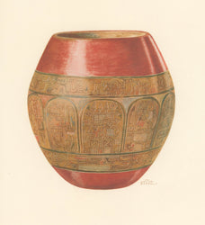 Between 1925 and 1943, Baker’s beautiful ink and watercolor illustrations were published in the three-volume Examples of Maya pottery in the Museum and other collections (edited by G.B. Gordon and J. Alden Mason). Most likely the three volumes were sold by subscription in a limited edition, mostly purchased by museums, thus making these colorful and detailed prints scarce. Each plate is described in pencil upper right hand corner.