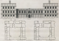 A print from a series of distinguished architectural views and plans of important contemporaneous British buildings, by one of England's famed 18th-century architects. Colen Campbell's purpose, through these large and beautifully executed drawings, was to praise and promote a great school of neo-Palladian design and building by proudly illustrating the work of his notable contemporaries, such as Inigo Jones. As the title of the work suggests, his aim was to link England's glorious present with the concerns of the exalted first century B.C.E. 'classical' architect, Vitruvius.