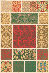 A print from Owen Jones' handsome series of chromolithographic plates illustrating the many different styles of decoration used from ancient times to the mid-nineteenth century by civilizations from all parts of the world. Ancient civilizations of Egypt, Greece, Rome, Celts, Maya, Persia, India and other Asian cultures are represented, as well as Medieval, Renaissance and later styles used in European countries. Drawing from the collection now known as the Victoria and Albert Museum, Jones distilled widely varying forms into their essential visual vocabulary, arranging design components in a new, accessible manner. Fabulously colorful and appealing images from the early days of chromolithography.