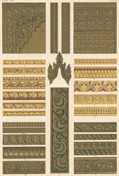 A print from Owen Jones' handsome series of chromolithographic plates illustrating the many different styles of decoration used from ancient times to the mid-nineteenth century by civilizations from all parts of the world. Ancient civilizations of Egypt, Greece, Rome, Celts, Maya, Persia, India and other Asian cultures are represented, as well as Medieval, Renaissance and later styles used in European countries. Drawing from the collection now known as the Victoria and Albert Museum, Jones distilled widely varying forms into their essential visual vocabulary, arranging design components in a new, accessible manner. Fabulously colorful and appealing images from the early days of chromolithography.
