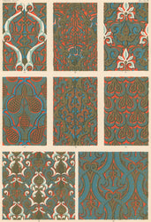 A print from Owen Jones' handsome series of chromolithographic plates illustrating the many different styles of decoration used from ancient times to the mid-nineteenth century by civilizations from all parts of the world. Ancient civilizations of Egypt, Greece, Rome, Celts, Maya, Persia, India and other Asian cultures are represented, as well as Medieval, Renaissance and later styles used in European countries. Drawing from the collection now known as the Victoria and Albert Museum, Jones distilled widely varying forms into their essential visual vocabulary, arranging design components in a new, accessible manner. Fabulously colorful and appealing images from the early days of chromolithography.