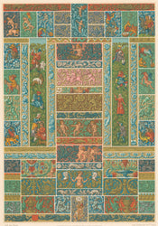 From a striking series of bright chromolithographs illustrating decorative motifs from Europe and Asia, dating from the classical period through the eighteenth century. The motifs include decorations used in rugs, wall paper, frescoes, and other architectural and interior elements. Assembled by Racinet in a design encyclopedia for the curious and the creative, these intricate and beautifully colored motifs represent worldwide inspirations and heritage of styles from architecture, and the decorative arts.