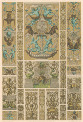 From a striking series of bright chromolithographs illustrating decorative motifs from Europe and Asia, dating from the classical period through the eighteenth century. The motifs include decorations used in rugs, wall paper, frescoes, and other architectural and interior elements. Assembled by Racinet in a design encyclopedia for the curious and the creative, these intricate and beautifully colored motifs represent worldwide inspirations and heritage of styles from architecture, and the decorative arts.