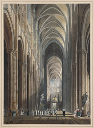From a series of beautifully realized interior and exterior views of the great cathedrals of Europe and England. Every architectural and sculptural detail, from the intricate spandrels, stained glass windows, and facade sculptures, to the magnificent arches and turrets, is rendered with the utmost finesse and understanding. The incidental figures and decorative embellishments are executed with equal skill and thoughtfulness, with the rich and subtle hand coloring adding information and convincing illusion, as well as abundant visual delight. These large scale prints offer an excellent opportunity to savor the ecclesiastical monuments of the West, as well as being glorious decorative images in their own right. The early 19th-century English success with aquatint and architectural rendering survives here in elegant splendor.