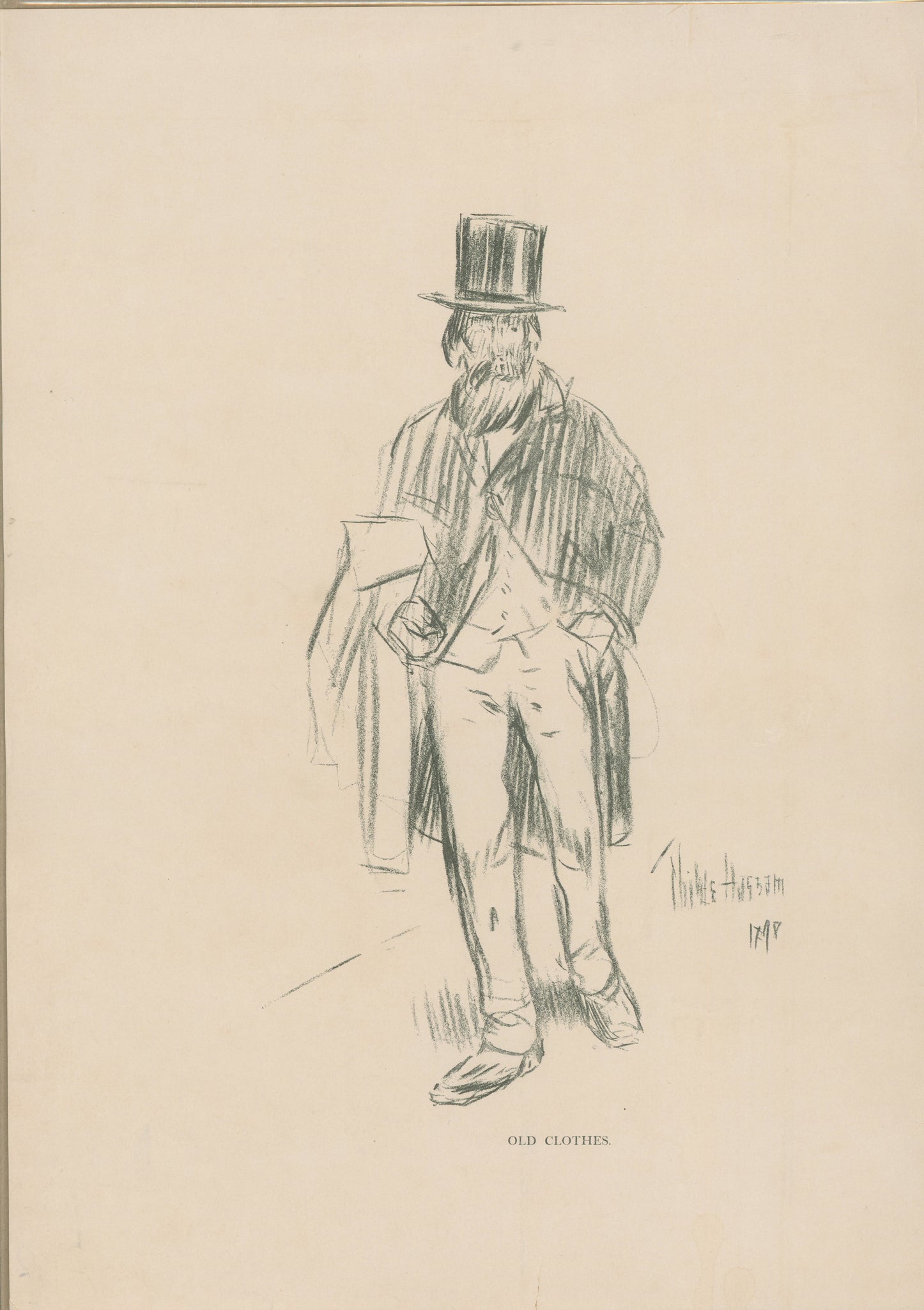 Hassam depicted street scenes from his earliest boyhood. In New York, Boston, Paris and London he saw poetry, romance and beauty in people walking through architectural canyons of their own creating. In 1900 Hassam exhibited Twenty Seven Drawings of New York, London and Paris Streets. #s 1 to 4 were of New York; #s 5 to 13 were of London; and, #s 14 to 27 of Paris. “Old Clothes” was #21 in Paris.