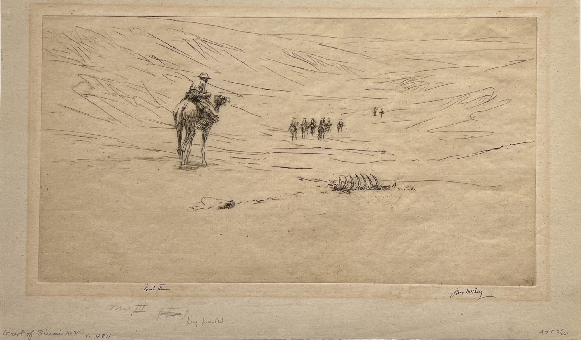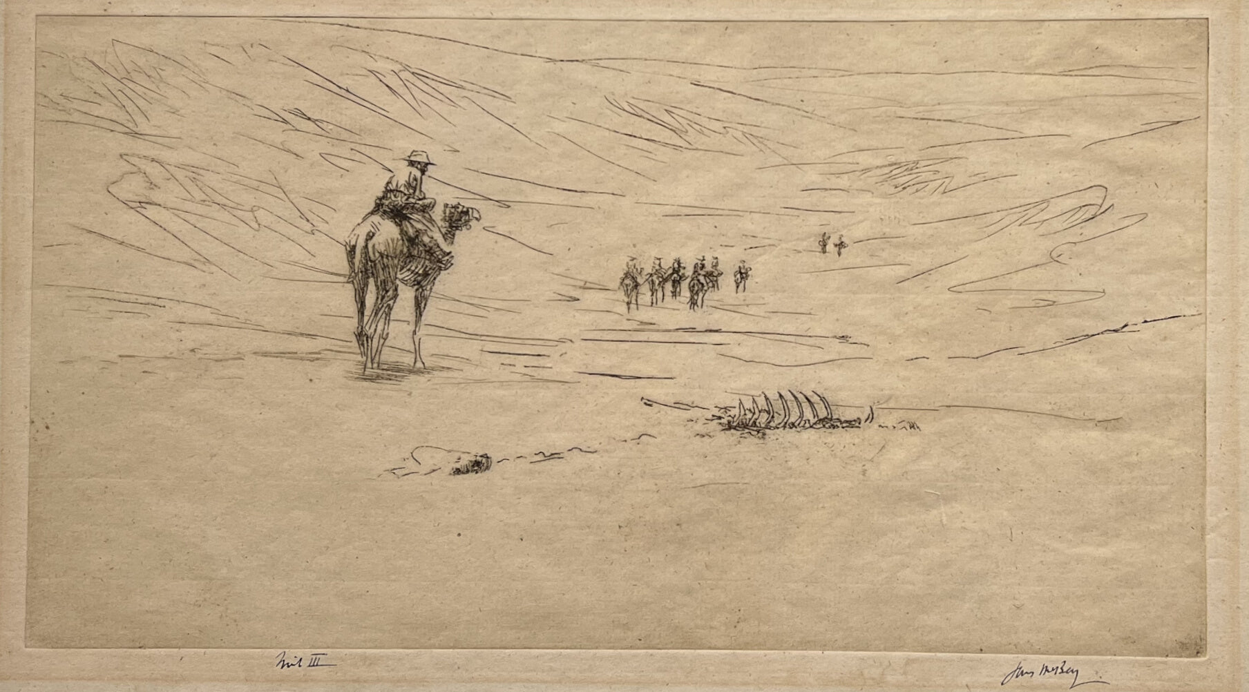 Description: The Camel Patrol is crossing the Desert of Sinai between hills of drifting sand. (Their route is that over which the Turks retreated to Beersheba after their unsuccessful attack on the Suez Canal.) In the foreground a single rider is passing the skeleton of a camel lying, to his right, on the sand. In the middle distance, the patrol of six riders, and two guides further in front.- Hebert Furst in Original Engraving and Etching: An Appreciation.