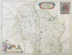 A wonderfully decorative map of this French region by Willem (Guilielmus) Janszoon Blaeu (1571-1638), the progenitor of the famous Blaeu cartographic firm of Amsterdam. Blaeu studied astronomy and sciences with Tycho Brahe, and in 1599 established a globe and instrument making business which soon expanded to include cartographic and geographic publishing. This firm was to go on to become the largest and most important cartographic publishing firms in the world, run by his sons Cornelis (until his death in 1642) and Joan. The maps issued by the Blaeu firm are known for their fine craftsmanship and design, and have been called “the highest expression of Dutch cartographical art.” These maps, with their excellent original color, are premier examples of the Blaeu output.