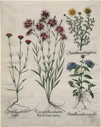 Basil Besler. Plate 317. Plumed meadow pink; Proliferous pink; Large-flowered self-heal; Golden marguerite. From Hortus Eystettensis.