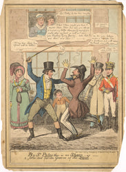 Petersham was infamous for his attentions to any and every lady he found attractive, and this print caricatures an incident that took place when Wedderburn-Webster became outraged by Petersham's flirtations with Lady Frances. In St. James's Street the outraged husband accosted the roué and applied a whipping with a whip, as shown here, or perhaps a cane. This would lead to a farcical "duel" wherein neither was injured, leading to a reconciliation.