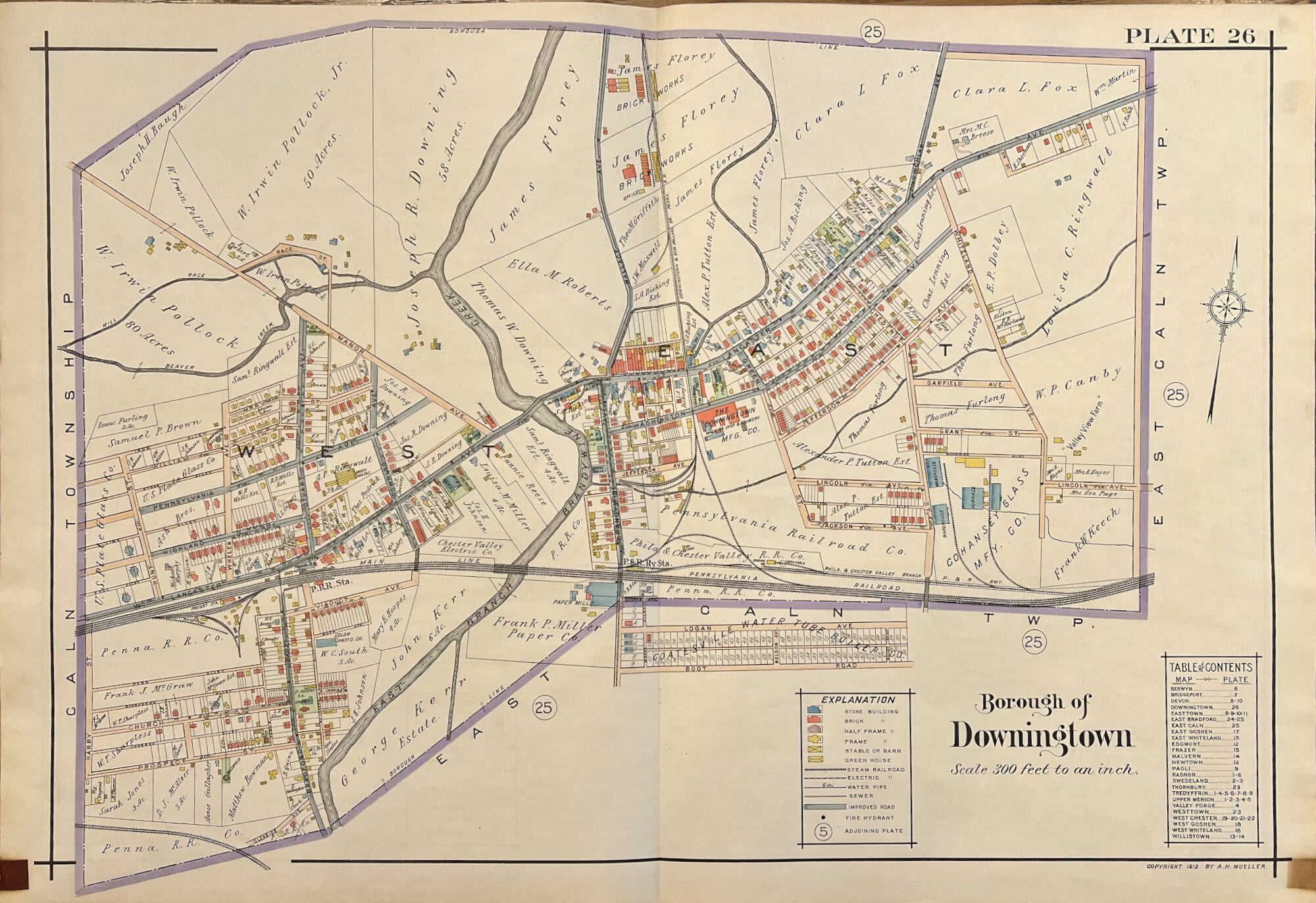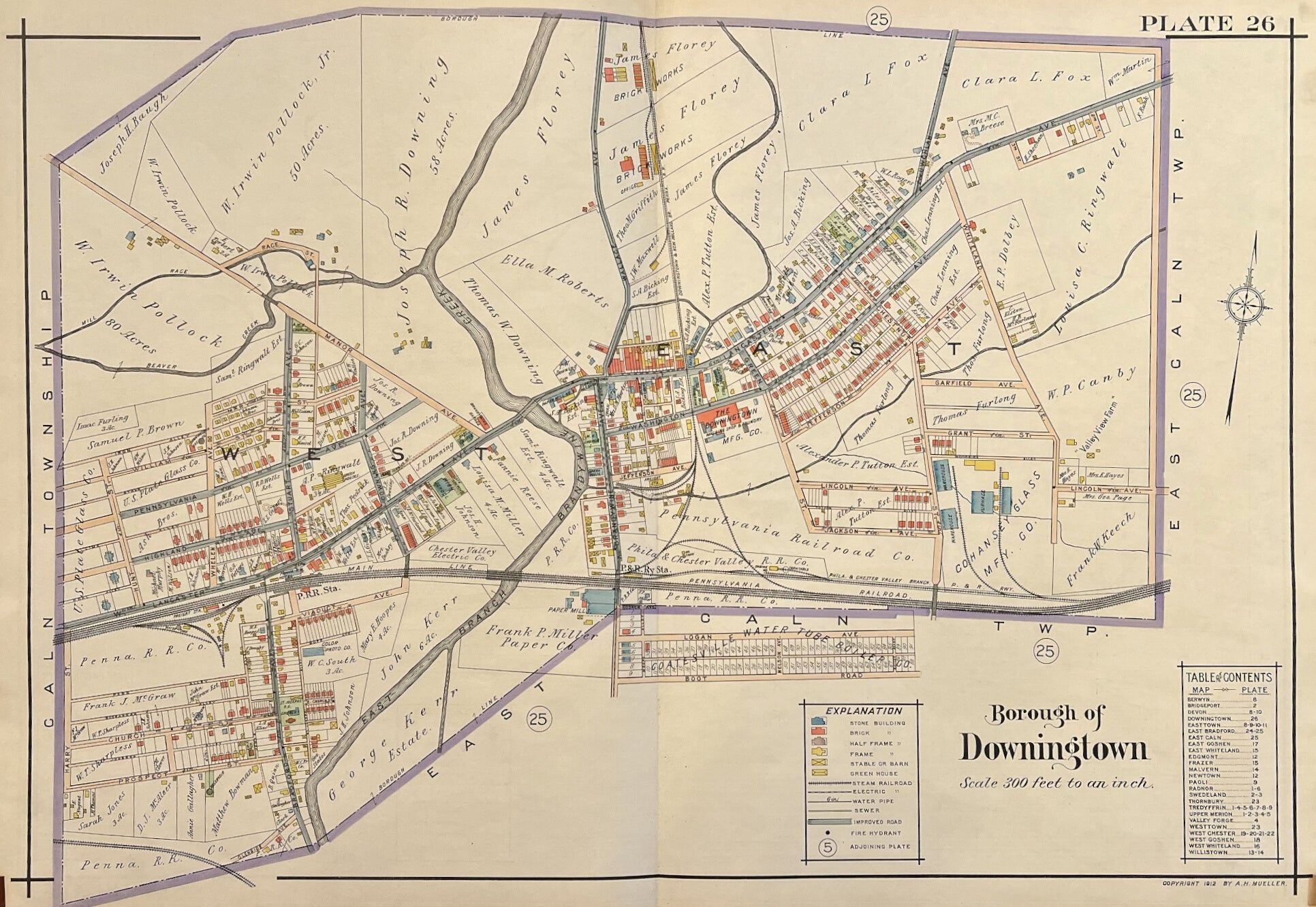 A.H. Mueller. Plate 26. "Borough of Downingtown" From Atlas of Properties on Main Line Pennsylvania Railroad from Devon to Downingtown and West Chester.