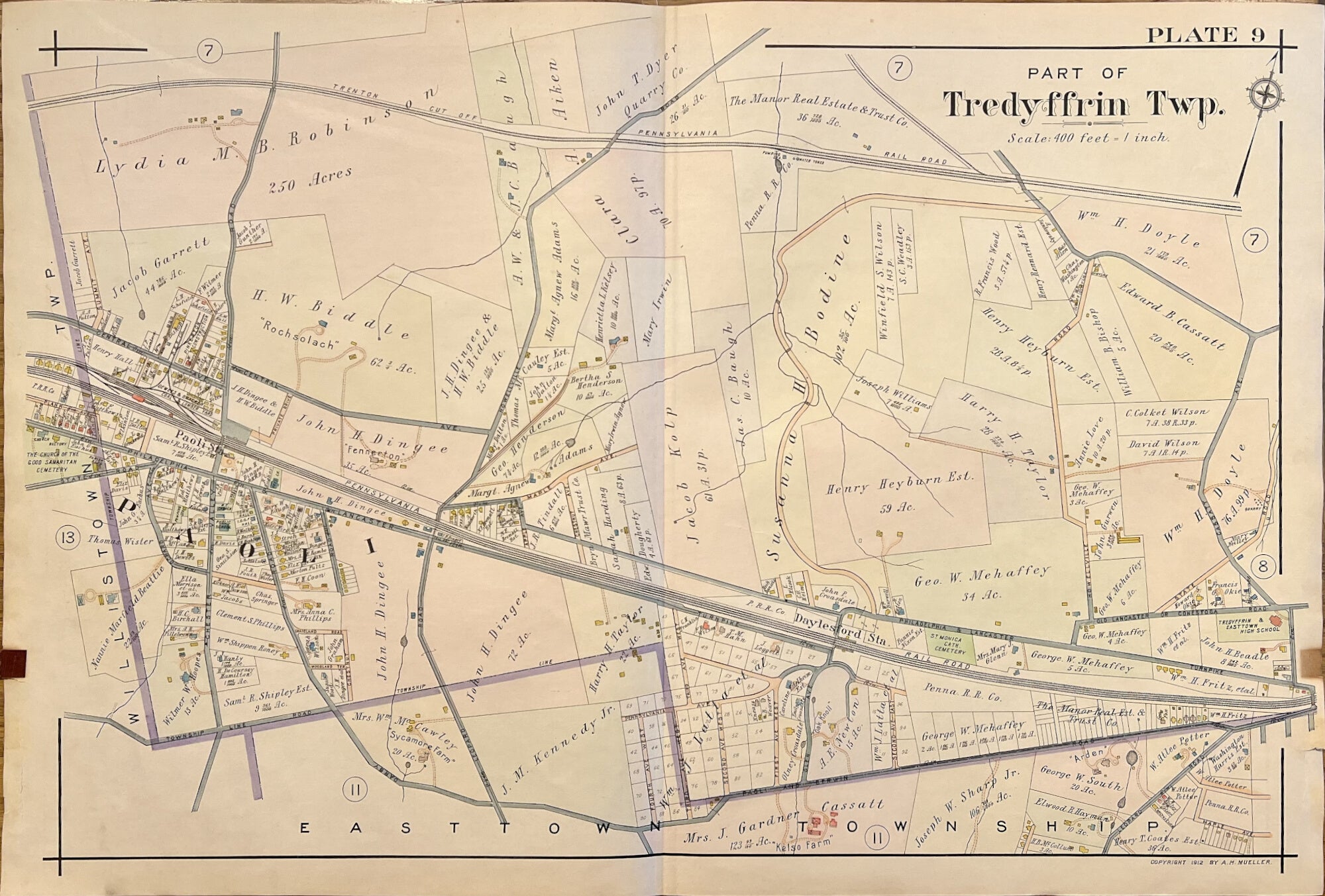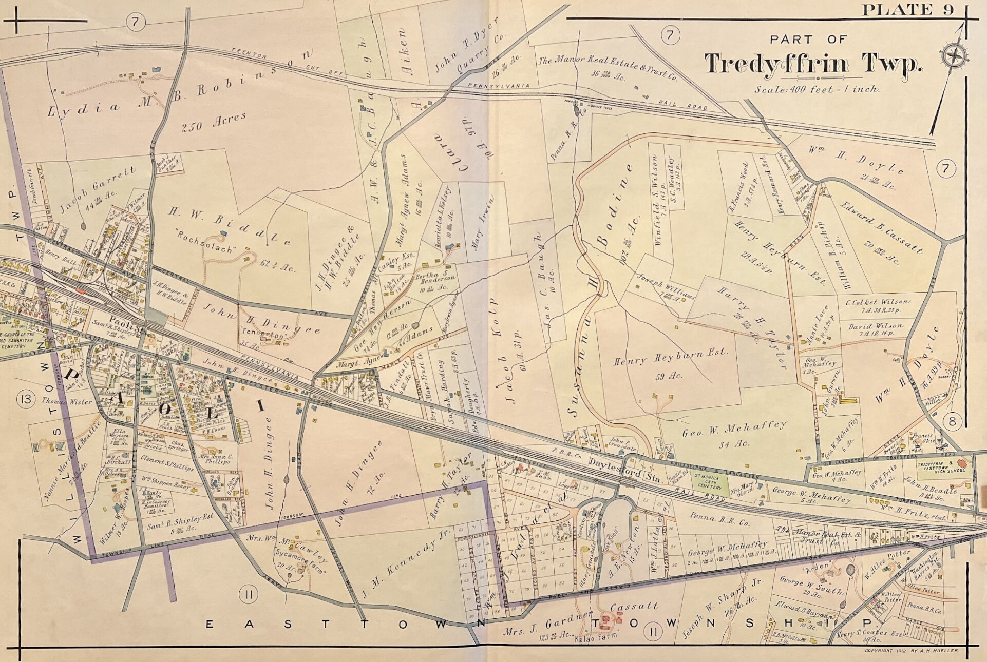 A.H. Mueller. Plate 9. "Part of Upper Merion" [Daylesford/Paoli] From Atlas of Properties on Main Line Pennsylvania Railroad from Devon to Downingtown and West Chester.