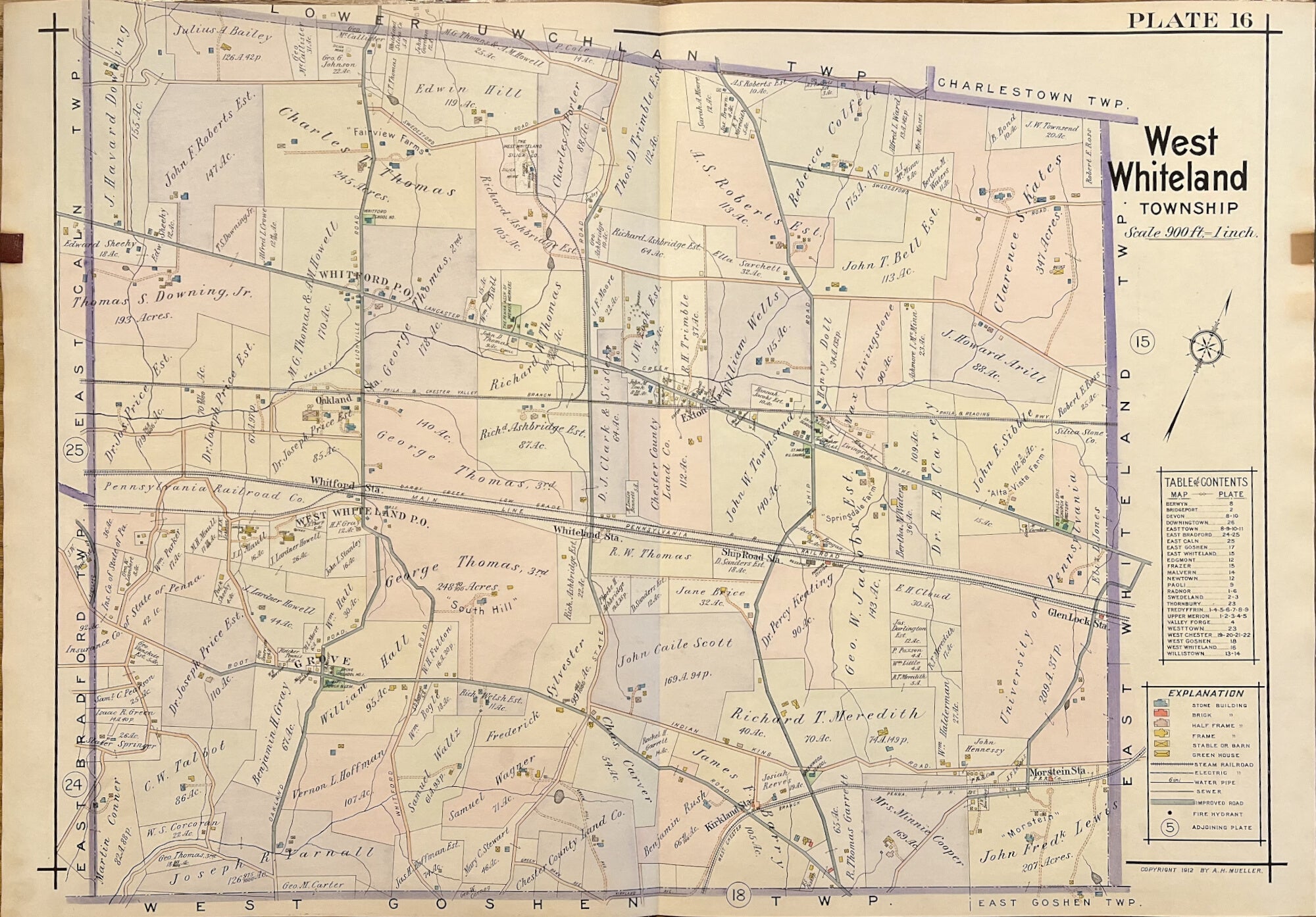 A.H. Mueller. Plate 16. "West Whiteland" From Atlas of Properties on Main Line Pennsylvania Railroad from Devon to Downingtown and West Chester.