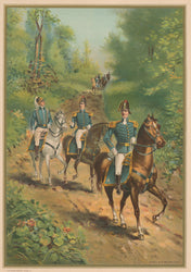 A print from a series illustrating the history and the uniforms of the American Army and Navy, from the American Revolution to the Spanish American War. The prints were issued by the Werner Company of Akron, Ohio, and they were made with vivid chromolithography.