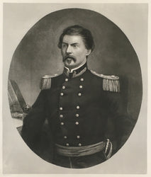 An interesting portrait of General George B. McClellan probably issued after his death in 1885. The image is attributed to being based on a photograph, but that refers only to the face, for the body appears to have earlier belonged to another individual. It is interesting to note that his hair is parted on the right hand side where as McClellan parted it from left to right. Behind McClellan’s head, a ghost image of another head is visible, indicating that this print was pulled from a plate which originally had the image of another person. The body, other than perhaps the top of the uniform, shows little evidence of any modification, but the books shown to the left of the print were engraved in place of a candle, the ghost image of which can also be seen. An interesting example of the reuse of a plate by a print publisher in the nineteenth century.