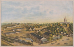 This is one of the more interesting prints of a camp in Washington, D.C. because it not only shows the outline and architecture of Soldier's Rest, but also it shows a train arriving amid joyous cheers as well as the surrounding houses on Capitol Hill. To the right background is the U.S. Capitol shown with the Thomas U. Walter dome completed, even though in 1864 the dome was incomplete and had scaffolding on it.