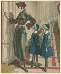 An attractive print from a series of enticing portrayals of nineteenteens and twenties high fashion by renowned French designers. The colors are brilliant-either simulating or actual pochoir technique; the designs and settings stylish and sophisticated. These visually striking images and fine mementos of the elegant and extravagant Parisian world were on the cutting edge of the art deco tradition.