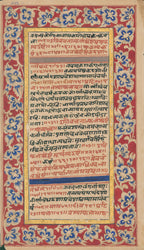This hand drawn and bold colored page is supplemented by the gold leaf outline that provides a beautiful and eye-catching example of Hindu art of the time.