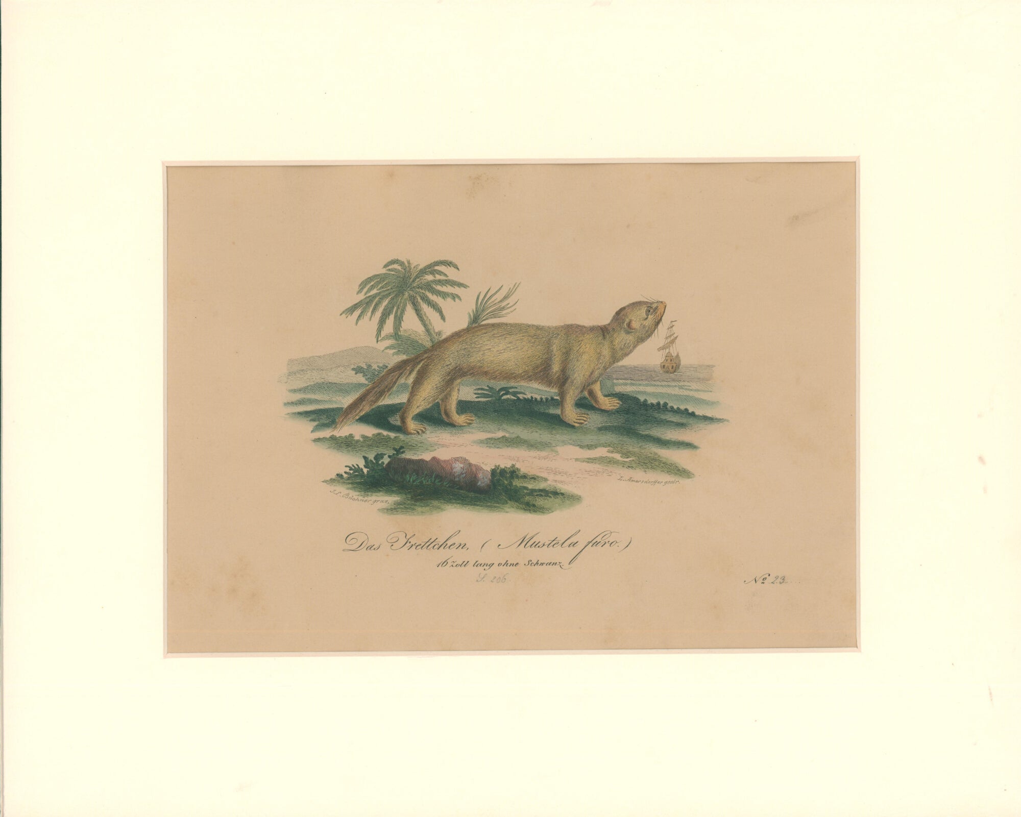 In the grand tradition of natural history prints, this image both delights the eye and informs the mind.  Skillfully drafted, each animal in Büchner’s work appears in profile against a picturesque representation of its primary habitat.    Clean, well-executed lithography shows off even fine details, like the texture of the animal’s fur coat.  Original hand color enhances both the accuracy and the aesthetics of each print.  To satisfy the curious viewer, average measurements are noted below titles.  Though printed in German, this group of Säugethiere, or mammals, reaches far beyond western Europe to include species from parts of Africa and Asia alongside local animals.  Beyond his language, little is known about artist J.L. Büchner, but his keen eye and skill place this series among finest educational and decorative natural history series of the early nineteenth century.
