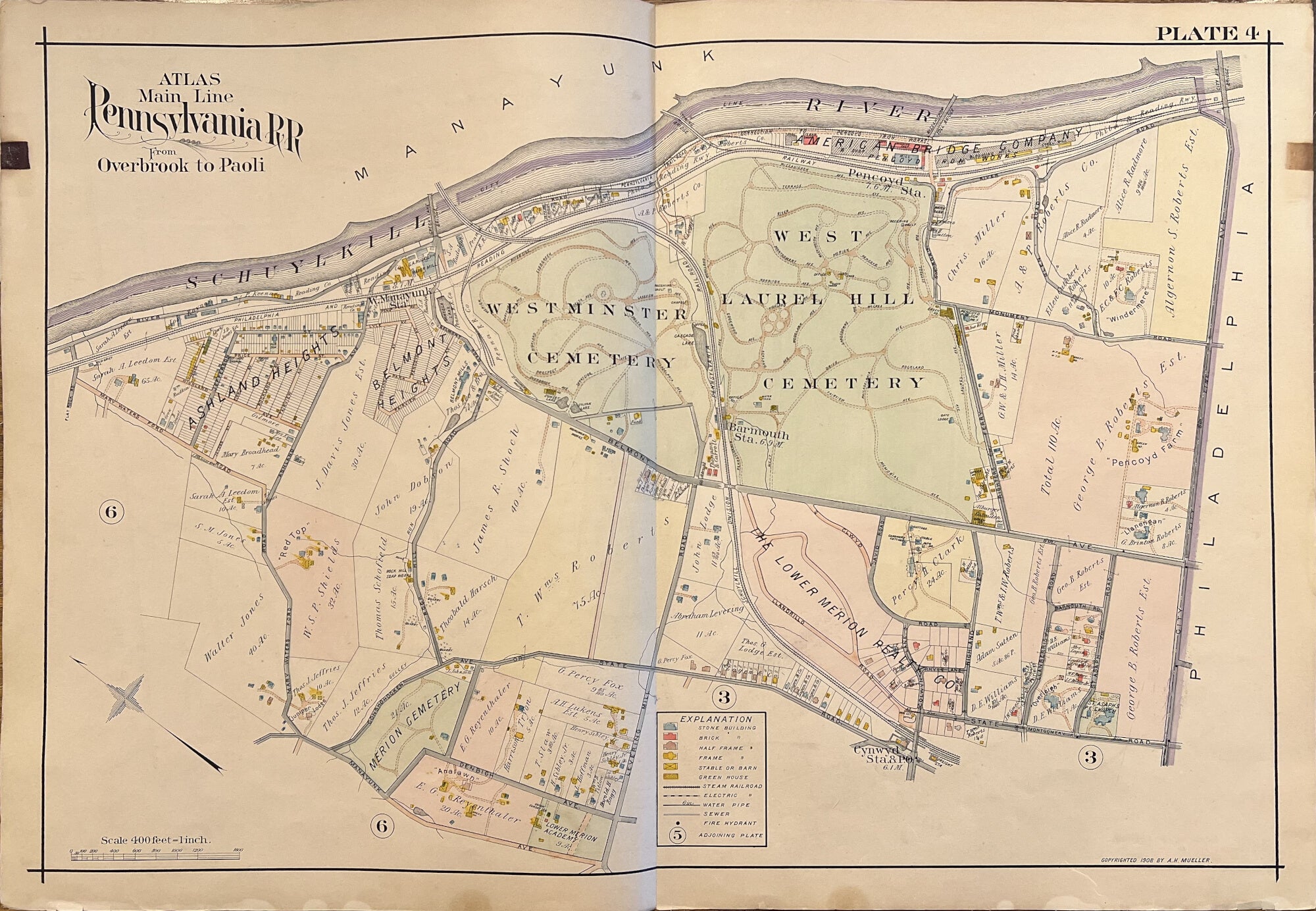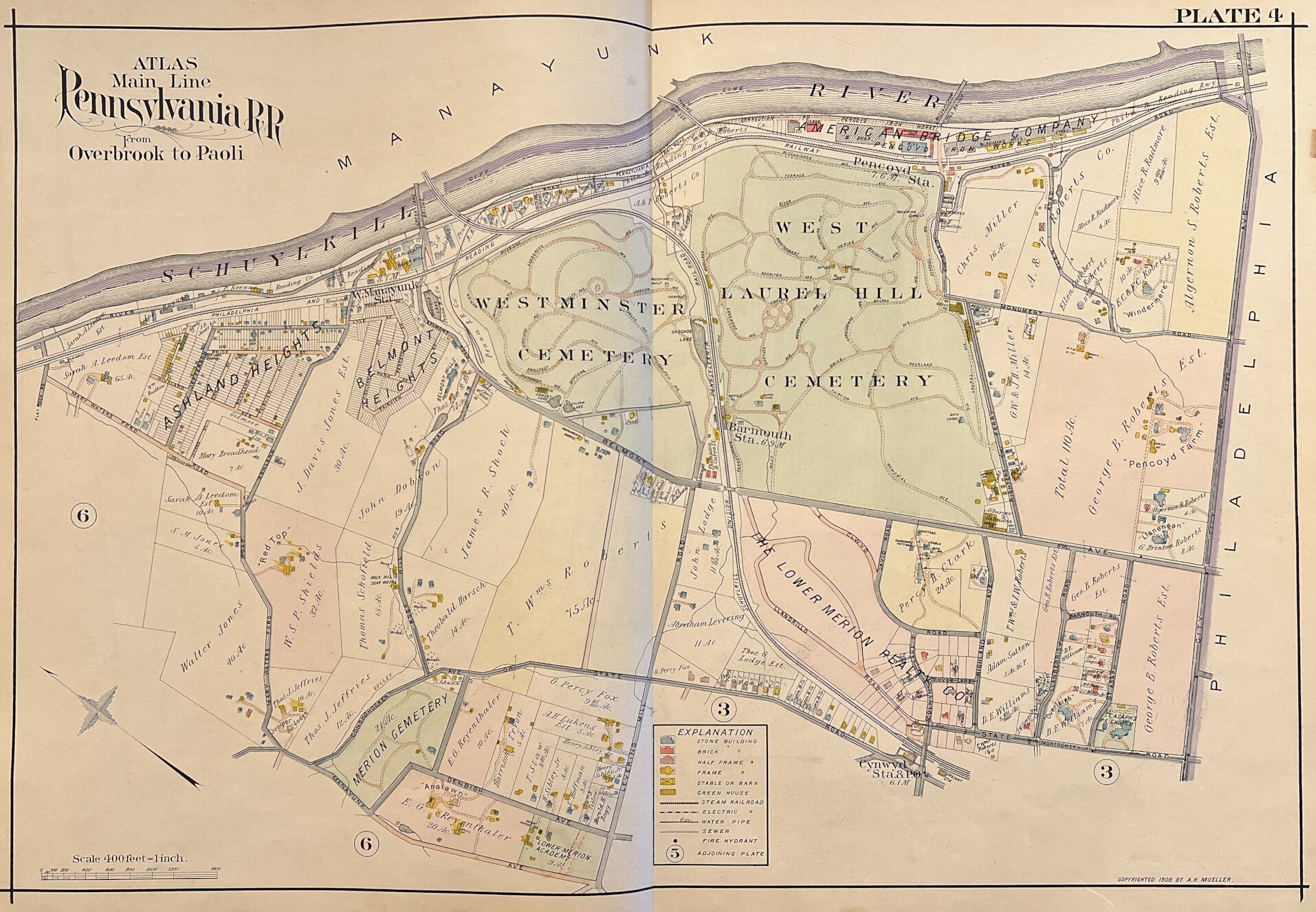 A.H. Mueller. Plate 4. [Bala/ LH Cemetery]. From Pennsylvania Railroad Atlas of the Main Line from Overbrook to Paoli.