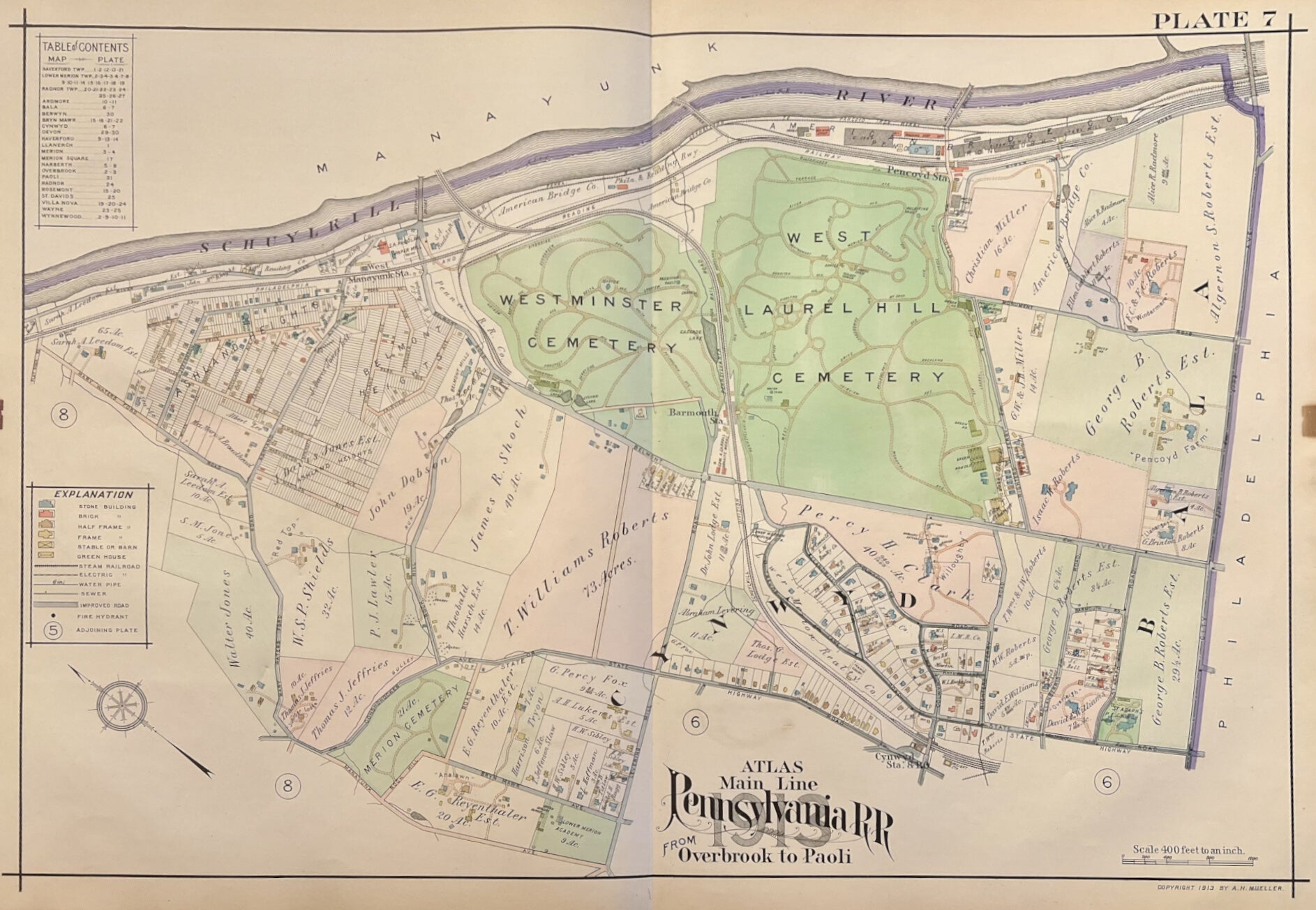 A.H. Mueller.  Plate 7. [Belmont/Laurel Hill Cemetary]. From Pennsylvania Railroad Atlas of the Main Line from Overbrook to Paoli.