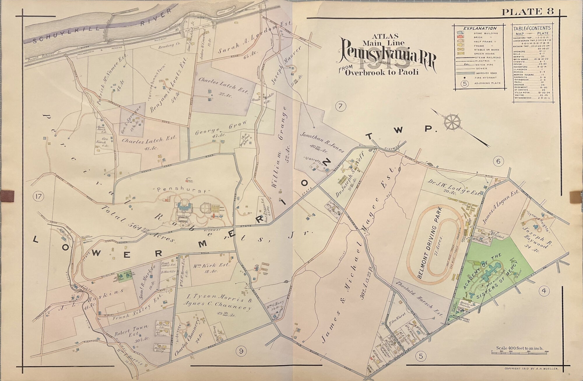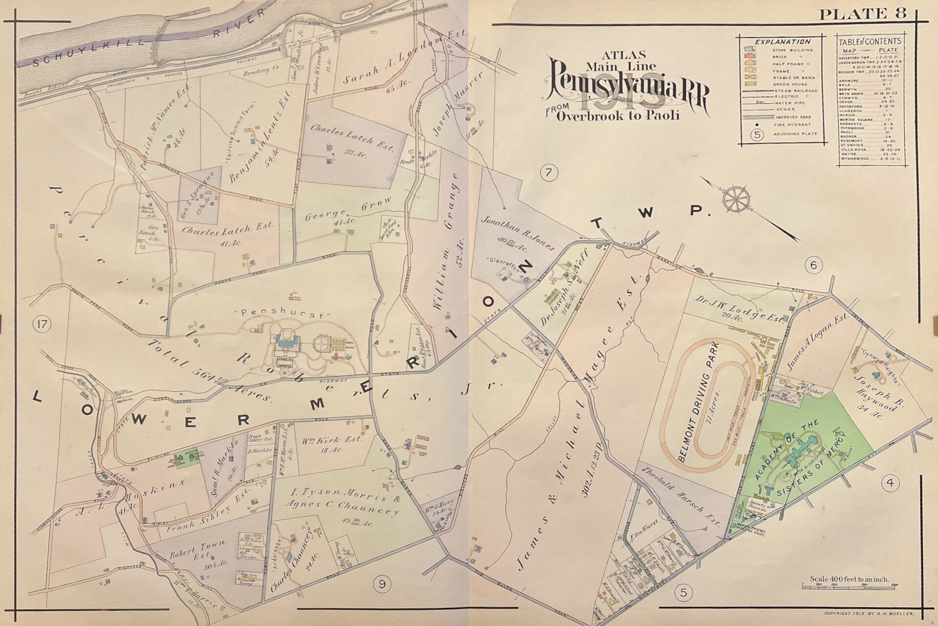 A.H. Mueller.  Plate 8. [Gladwyne/ Mill Creek]. From Pennsylvania Railroad Atlas of the Main Line from Overbrook to Paoli.