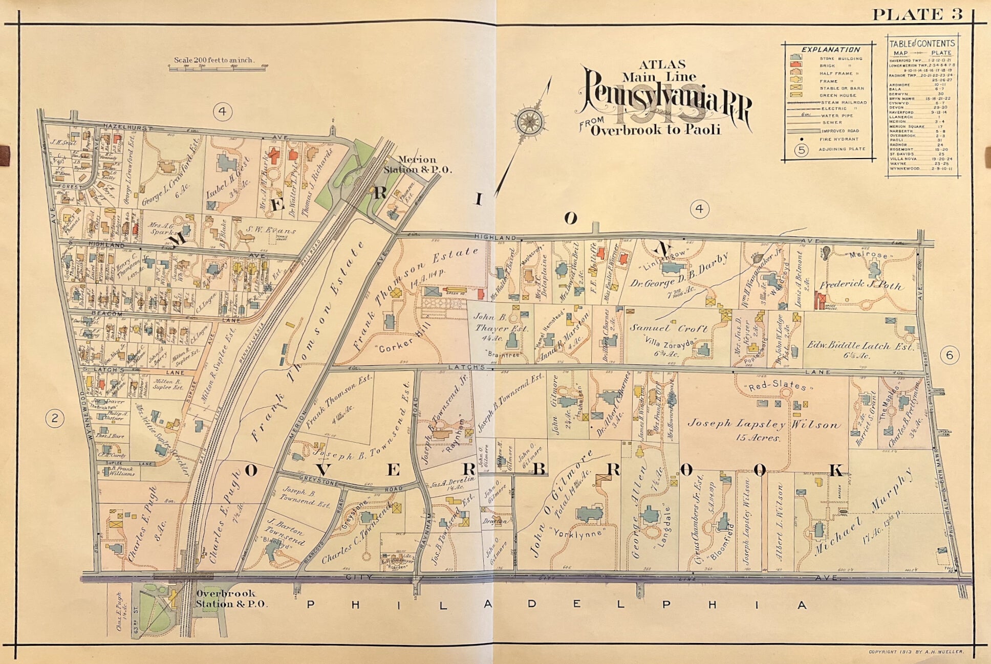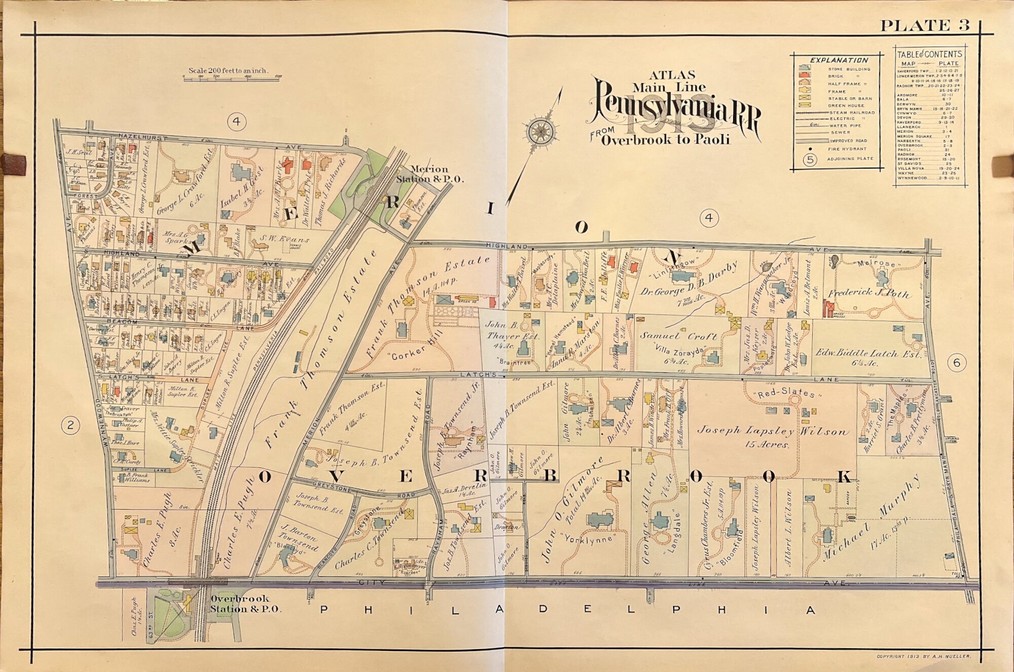 A.H. Mueller. Plate 3. [Merion Station/Overbrook]. From Pennsylvania Railroad Atlas of the Main Line from Overbrook to Paoli.