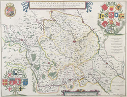 A wonderful decorative map of this French region by Willem (Guilielmus) Janszoon Blaeu (1571-1638), the progenitor of the famous Blaeu cartographic firm of Amsterdam. Blaeu studied astronomy and sciences with Tycho Brahe, and in 1599 established a globe and instrument making business which soon expanded to include cartographic and geographic publishing. This firm was to go on to become the largest and most important cartographic publishing firms in the world, run by his sons Cornelis (until his death in 1642) and Joan. The maps issued by the Blaeu firm are known for their fine craftsmanship and design, and have been called “the highest expression of Dutch cartographical art.” These maps, with their excellent original color, are premier examples of the Blaeu output.