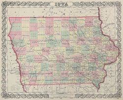 In the mid-nineteenth century, the center of map publishing in America moved from Philadelphia to New York. The J.H. Colton publishing firm played a large role in this shift. This map of Iowa, with its fine detail, is a strong example of their successful work. The map presents the counties in contrasting pastel shades, and includes depictions of towns, rivers, marshes, and some topography. Of particular interest are the indications of the burgeoning transportation network in the state, with roads and railroads clearly shown, especially in the eastern part of the state and along the southern tier, connecting Des Moines with Omaha City and Elkhorn City in Nebraska. An attractive map as well as a worthwhile historical document.