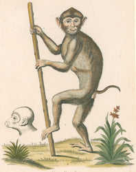 One of a series of delightful prints of monkeys and other primates from Johann van Schreber’s natural history. Von Schreber studied theology, medicine and natural history, ending up in 1773 as director of the botanical gardens and natural history museum at Erlangen. There he authored a natural history which included 755 engravings of the mammals of the world, including these charming monkeys. Von Schreber relied, for his illustrations, on a number of artists, some of whom drew their images based on written or verbal descriptions rather than first hand observations. Thus the prints contain many errors, and indeed in some cases have a fantastical appearance. They are, though, wonderful examples of eighteenth century natural history with a decorative appeal that has appealed across the years.