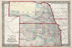 A Mitchell map of the two states as they were configured shortly after statehood and the completion of the transcontinental railroad. Kansas, through which the Pacific Railroad ran, was highly developed at this point, as can been clearly seen here. The Pacific R.R. is shown, as is the Atchison, Topeka & Sante Fe R.R., and a few others in the state, bringing considerable growth of towns, roads, and so forth. Nebraska shows the Union Pacific Railroad passing through, but development is considerably less, limited mostly to the east and south of the Platte River. An excellent early picture of these two plains states.
