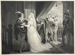 A print from a magnificent series of British based works of William Shakespeare published by the great John Boydell. Boydell, a land surveyor in the employment of his father, was inspired by an engraving by W.H. Toms to leave his home in Shropshire about 1750 and walk to London to apprentice himself to Toms. After six years, Boydell set up his own shop and began his career as a print publisher. He was much concerned with the French dominance of the European print market at mid-century, and mostly by his efforts in the 1780s Britain became a print exporting country.