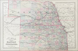 A precisely detailed map from the Philadelphia publishing firm of William M. Bradley & Bro. Bradley took over the publication of Mitchell’s New General Atlas in the early 1880s. This Kansas map is a fine example of nineteenth century American mapmaking. It shows the state in impressive detail, with emphasis on rivers, towns, and the myriad railroad lines criss-crossing the state. Counties are delineated with attractive, light pastel colors.
