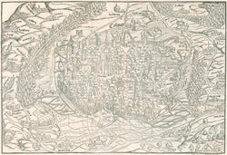 A fine sixteenth century wood cut by Sebastian Munster. Munster was one of the greatest cartographers in the era before the Dutch “modern” cartographers such as Mercator and Ortelius, and he produced influential maps in his editions of Ptolemy’s Geographia and Cosmographia. Topographical detail is surprisingly copious, with data on cities, regions, mountains and rivers abundant and of considerable historic interest. In many cases, these prints were the finest at the time, and today are some of the earliest views of European cities.