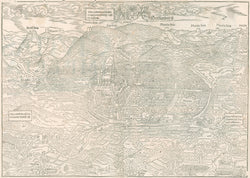 A fine sixteenth century wood cut by Sebastian Munster. Munster was one of the greatest cartographers in the era before the Dutch “modern” cartographers such as Mercator and Ortelius, and he produced influential maps in his editions of Ptolemy’s Geographia and Cosmographia. Topographical detail is surprisingly copious, with data on cities, regions, mountains and rivers abundant and of considerable historic interest. In many cases, these prints were the finest at the time, and today are some of the earliest views of European cities.