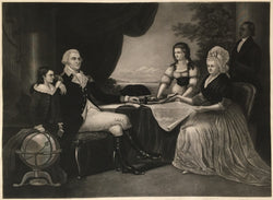 The Edward Savage painting of George Washington and his family was a classic as soon as it was created, and the artist commissioned an engraving which appeared as early as 1798. This print was published by Thomas Kelly, most likely during the Civil War, who was one of the more successful print publishers of the mid-nineteenth century. All the members of Washington’s family are shown, including his favorite manservant William Lee. The faces of the group were based on first hand sketches that Savage made before he left for London in 1791. Savage placed the family group around a table upon which rests a map of the planned city of Washington. In the background is shown a scene of a ship-filled Potomac River at Mount Vernon. Informal group portraits such as this had become fashionable in England, and the popularity of these scenes soon transferred to America.