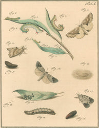 A print by Jan Christiaan Sepp (1739-1811) from a spectacular group of finely executed insect prints depicting each creature at several stages in its life cycle, as well as in its natural habitat in some cases. Many are shown in progression from egg to pupa, caterpillar, chrysalis and finally to butterfly or moth. Each stage is meticulously drawn and delicately hand colored. Even the undersides of the leaves upon which some of the caterpillars feed are a shade or two lighter than the top surfaces, and even fine veins are represented.