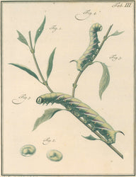 A print by Jan Christiaan Sepp (1739-1811) from a spectacular group of finely executed insect prints depicting each creature at several stages in its life cycle, as well as in its natural habitat in some cases. Many are shown in progression from egg to pupa, caterpillar, chrysalis and finally to butterfly or moth. Each stage is meticulously drawn and delicately hand colored. Even the undersides of the leaves upon which some of the caterpillars feed are a shade or two lighter than the top surfaces, and even fine veins are represented.