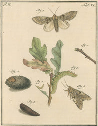 A print by Jan Christiaan Sepp (1739-1811) from a spectacular group of finely executed insect prints depicting each creature at several stages in its life cycle, as well as in its natural habitat in some cases. Many are shown in progression from egg to pupa, caterpillar, chrysalis and finally to butterfly or moth. Each stage is meticulously drawn and delicately hand colored. Even the undersides of the leaves upon which some of the caterpillars feed are a shade or two lighter than the top surfaces, and even fine veins are represented.