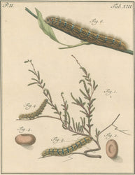 A print by Jan Christiaan Sepp (1739-1811) from a spectacular group of finely executed insect prints depicting each creature at several stages in its life cycle, as well as in its natural habitat in some cases. Many are shown in progression from egg to pupa, caterpillar, chrysalis and finally to butterfly or moth. Each stage is meticulously drawn and delicately hand colored. Even the undersides of the leaves upon which some of the caterpillars feed are a shade or two lighter than the top surfaces, and even fine veins are represented.