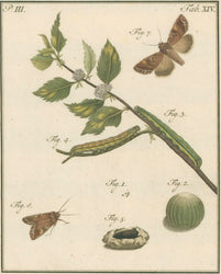A print by Jan Christiaan Sepp (1739-1811) from a spectacular group of finely executed insect prints depicting each creature at several stages in its life cycle, as well as in its natural habitat in some cases. Many are shown in progression from egg to pupa, caterpillar, chrysalis and finally to butterfly or moth. Each stage is meticulously drawn and delicately hand colored. Even the undersides of the leaves upon which some of the caterpillars feed are a shade or two lighter than the top surfaces, and even fine veins are represented.