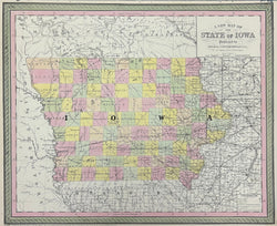 A strong, beautifully crafted map of Iowa from the mid-nineteenth century, published by Thomas, Cowperthwait & Co. This firm took over the publication of S. Augustus Mitchell's important Universal Atlas in 1850, and they continued to produce up-dated maps that were amongst the best issued in the period. This map shows a state beginning to come into its own, with development throughout the state. The maps issued by Thomas, Cowperthwait & Co. are known for their depiction of transportation systems and this map is no exception. The burgeoning network of roads and railroads is clearly depicted, connecting the many towns throughout this prosperous state. An excellent picture of Iowa at mid-century.