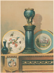 A sprint from a superb series depicting artifacts of art and industry that were displayed in various buildings at the great Centennial Exposition in Fairmount Park, Philadelphia. This world’s fair was an occasion of great pride for the people of the United States, and it gave a terrific impetus to American manufacturing and art. As masterpieces from all over the world were displayed at the exhibition halls, Americans had a wonderful opportunity to examine them at first hand. This series of prints preserved images through chromolithography which was the most advanced form of pictorial representation at the time. The colors are vivid and the details are clear, and they give us insights into the fine points of what was appreciated by hundreds of thousands of visitors to the Exhibition.