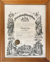 A decorative diploma issued to Winslow Lyon for the degree of Civil Engineer. Originally founded in 1821 as the Bullock School, the College changed names and locations several times until it moved to Chester where it became known as to Pennsylvania Military College. In 1972, due to the unpopularity of the Vietnam War the school ceased the military program and changed its name to Widener in honor of Eleanor Elkins Widener. At the bottom, is a view of the Main Building which still stands.