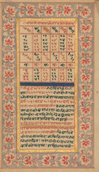 This hand drawn and bold colored page is supplemented by the gold leaf outline that provides a beautiful and eye-catching example of Hindu art of the time.