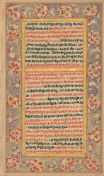 This hand drawn and bold colored page is supplemented by the gold leaf outline that provides a beautiful and eye-catching example of Hindu art of the time.