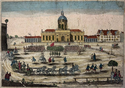 The optical machines used for these prints had a lens which enhanced for viewers the magnification and perception of three-dimensional depth of the scenes depicted. A mirror was often used so that the perspective prints could be viewed when laid flat, and in these cases the images were viewed in reverse. It is therefore not unusual that the scenes shown were drawn in reverse, and there is also often a title printed in reverse along the top, allowing the viewers to quickly read the title. There was usually further text at the bottom of the prints, often in several languages, which could be read by the operator of the optique for the benefit of his audience. The most characteristic feature of the perspective views is their emphasized linear perspective, done to further intensify the enhanced appearance of depth and illusionistic space in the prints when viewed through an optique. Another attribute of these prints is their bright, often crude hand coloring, applied boldly so to show the tints when viewed through the lens. The prints usually have a series of colors of blue, pink and yellow are common crossing in bands from side to side, with bright highlights often including red. These cheerful and colorful images, with their fascinating history and peculiar appearance, make for unusual and appealing eighteenth-century prints. It is quite common for these prints to have condition issues of sports, stains, tears… as these prints were meant to be handled and used and not framed.